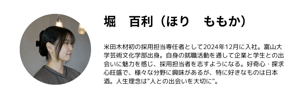 講師を務めたのは、米田木材の採用担当であり、入社6カ月目の堀 百利だった。23歳という若さで学生の前に立ち、自らの言葉で“働くこと”のリアルを伝えた。学生と年齢が近いからこそ、伝えられることがある。社会に出たばかりだからこそ、見えることもある。